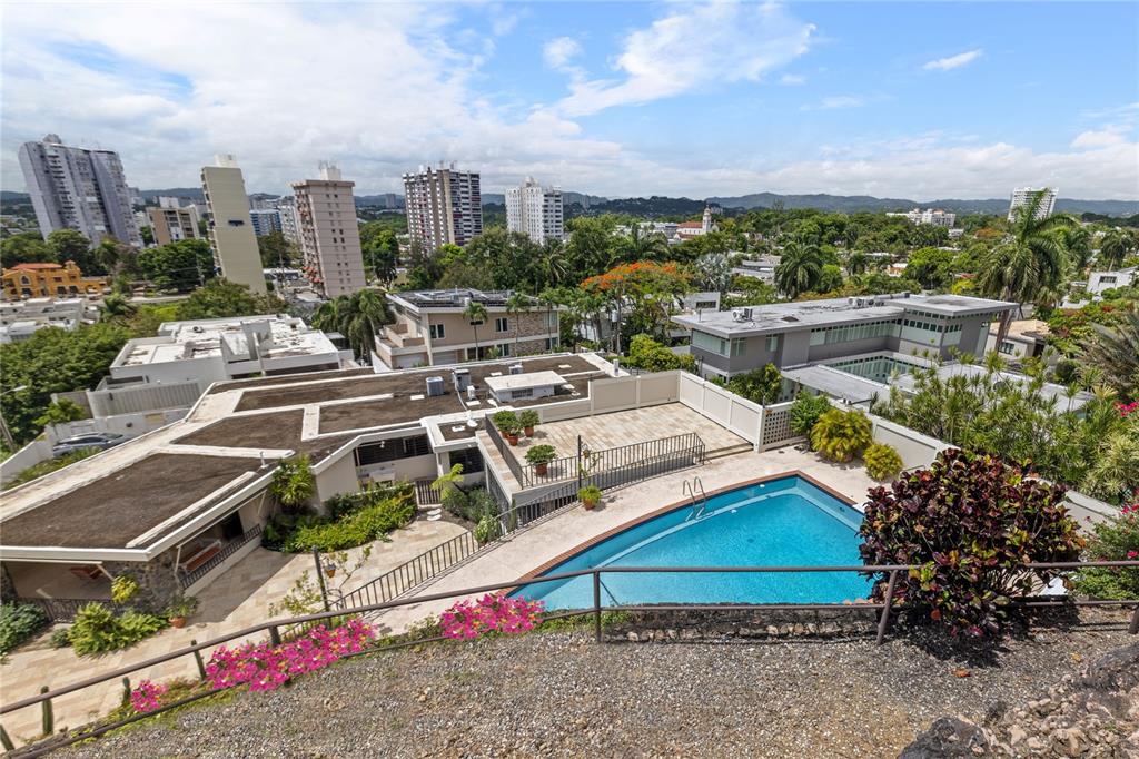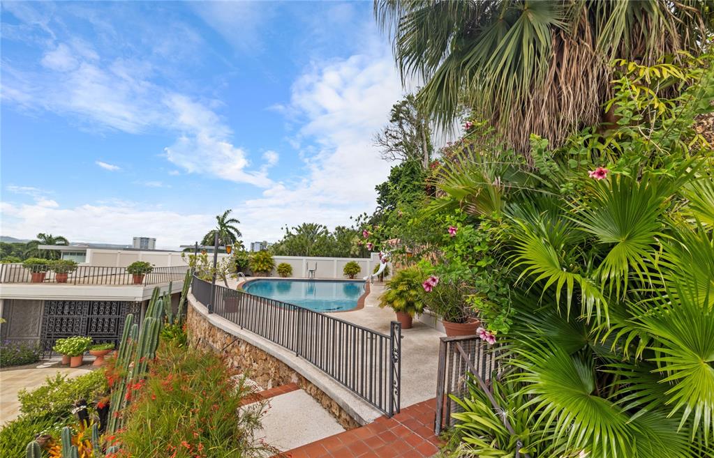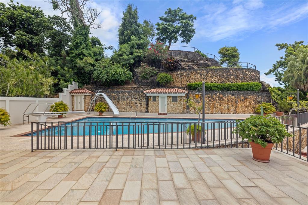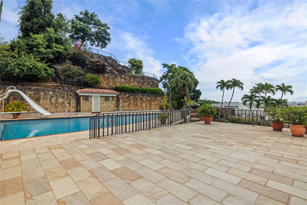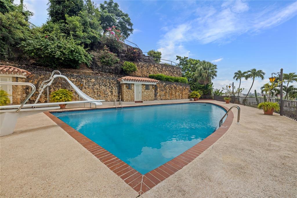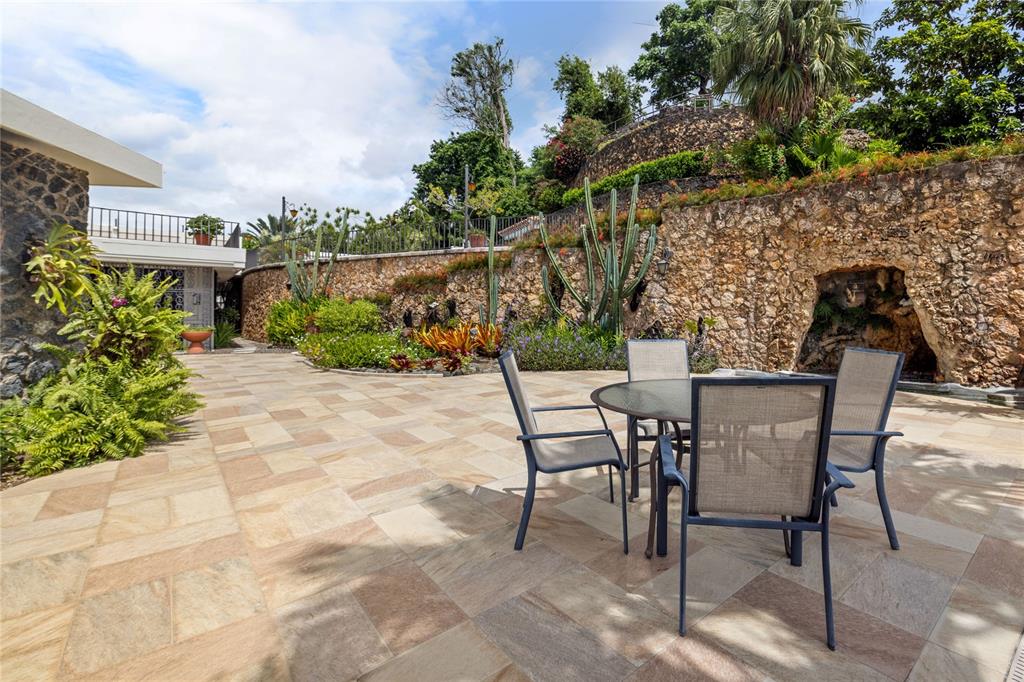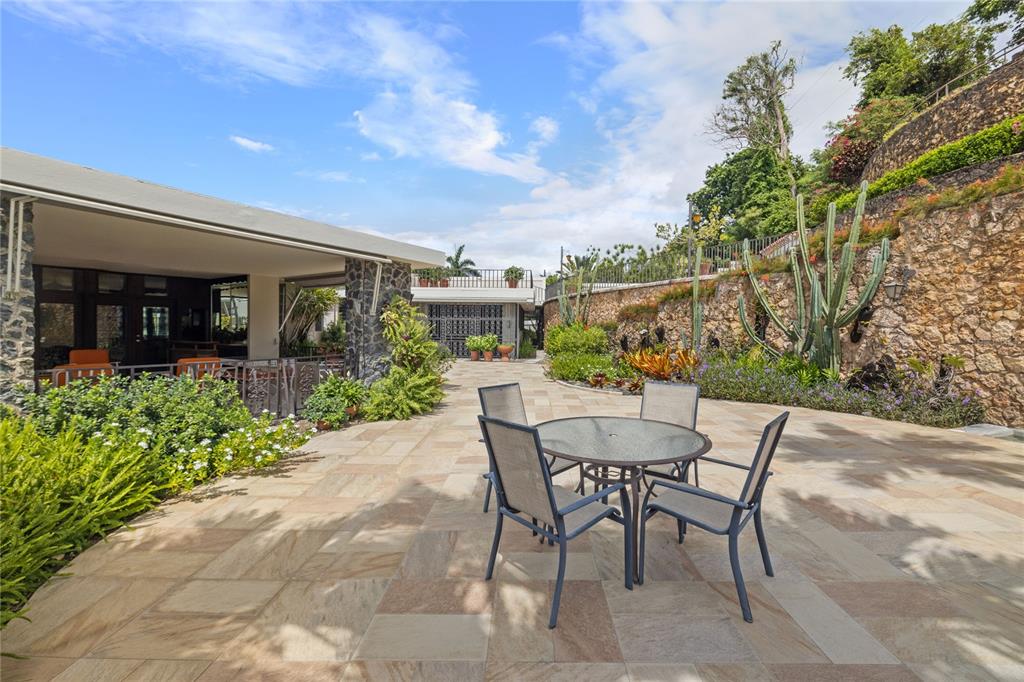 Experience serenity in this elegant home, perched on a small hill in Villa Caparra, Guaynabo, offering stunning city views of Guaynabo and San Juan. Enjoy the privacy of this residence and the refreshing breeze from the trade winds. Located in a gated and secure community with easy access through multiple entry points, this house is an ideal retreat. The property features a beautiful terrace overlooking a patio with a stone-covered wall, where all stones have been reclaimed from the original construction. The garden includes a charming fountain, several fruit trees, and a swimming pool area complete with a full bathroom. Inside, the home boasts pristine terrazzo floors with bronze inlays, high ceilings, and large windows that bathe the space in natural light. The spacious kitchen offers a view of the patio and is accompanied by a separate laundry room and maid’s quarters. Among the seven bedrooms and six bathrooms, a separate level includes a bedroom that could serve as a guest room, plus an office. The house encompasses 3,991 square feet of living space and sits on 1,993 square meters of land. Full back up 30 kilos generator, water tank, solar water heater and much more completes this classic and special house.