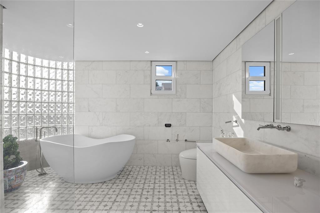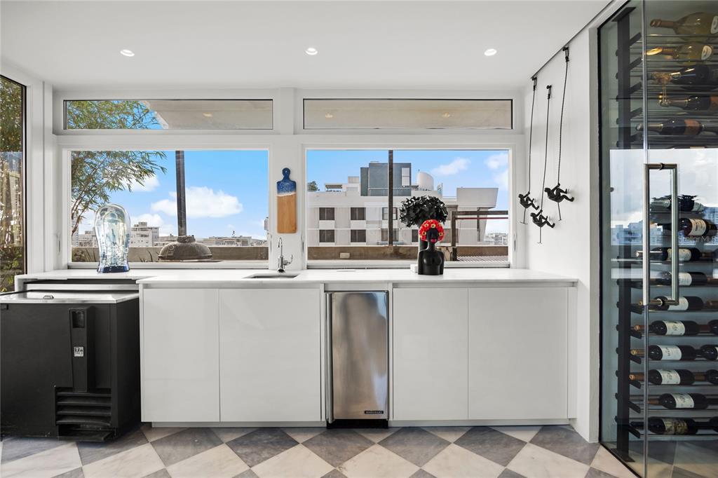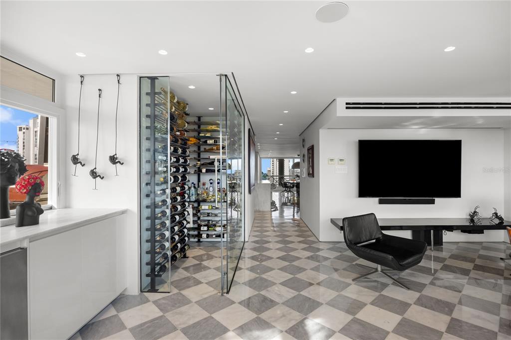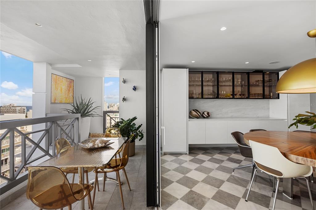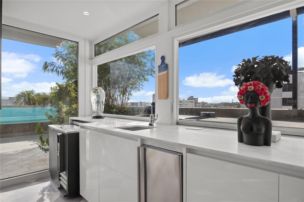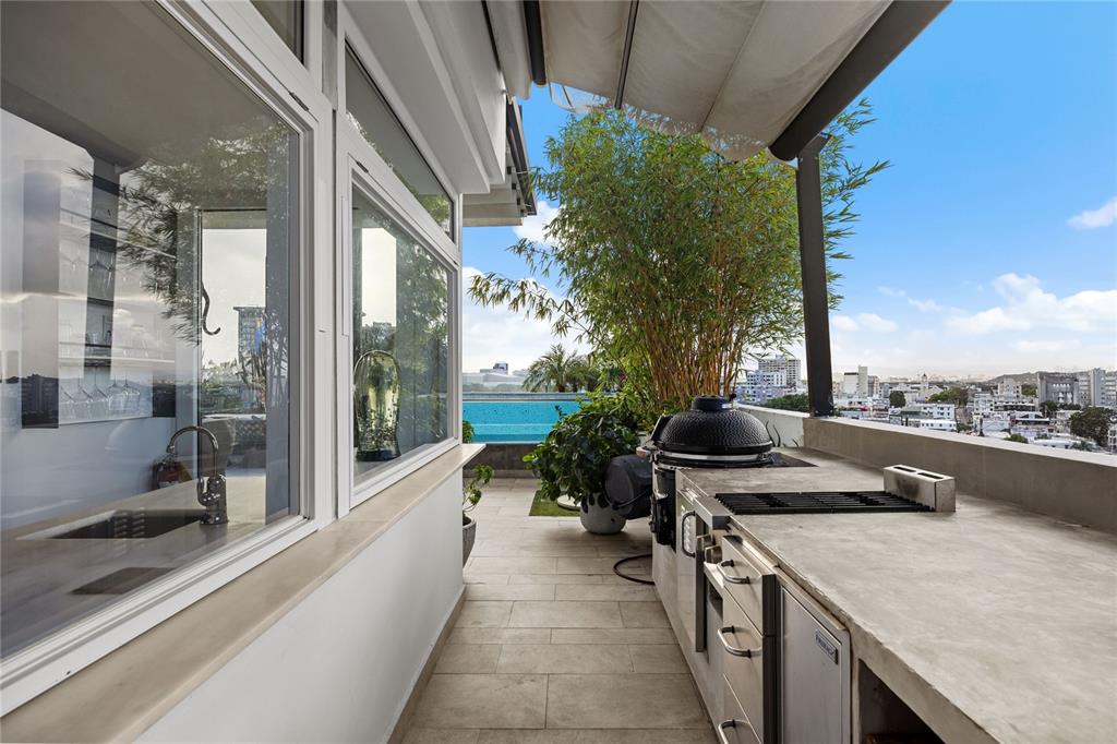 Welcome to the Penthouse at the Crowne Plaza! Located in coveted Luchetti Street in Condado, this exceptional property offers a harmonious blend of luxury, comfort, and modern design. Spanning two full floors – with an impressive 5,800 square feet, including 1,900 square feet of exterior space – this residence was thoughtfully designed by Pili & Co to cater to the most discerning tastes. Upon entering, you are greeted by expansive open spaces that seamlessly integrate with modern finishes, creating an inviting atmosphere. Lower level is the private one, featuring four bedrooms (truly convertible to five), 4 full bathrooms, a gym, a home office, a family room, and a balcony with city and ocean views. Main level is upstairs and is the social floor. There, you find an open kitchen, dining and living rooms, covered and uncovered terraces, an outdoor kitchen, a wine cellar, a fully equipped bar, pet area, and a wraparound balcony. Both levels are connected via a grand staircase and the elevators. The kitchen is open and bright. It features Italian CopatLife cabinets, a center-piece island with impressive Avalon marble countertops, and top of the line appliances: Miele induction stove – with a real vented range hood –, built-in Miele coffee system, Frigidaire Professional microwave/oven combo and an additional convection oven, dishwasher, and side-by-side refrigerator and freezer. The Bar also has Avalon marble countertops and is equipped with a True refrigerator, an ice maker, and a temperature-controlled 378-bottle wine cellar. The finishes are all custom: from Turkish marble to Swedish wooden floors, marble bathroom mosaics, custom marble sinks, and custom built-ins and doors. The windows are also hurricane-proof with integrated shutter system. The outdoor kitchen is a highlight of its own: Vision Grills bbq system, Thor range stove, Sunterra Argentinian grill, and an Italian Fontana Forni pizza oven. An entertainer’s dream for al-fresco dining! This penthouse is distinguished by its unique two-floor layout, providing a sense of grandeur and exclusivity. The wraparound terrace is unique and offers breathtaking 360-degree city skyline vistas, making it an ideal setting for both relaxation and entertainment. The rooftop pool adds an element of luxury, allowing you to unwind while taking in the panoramic vistas. For those who value fitness and wellness, the home gym is equipped to meet your exercise needs. The amenities are in your own space: the salt-water pool, the outdoor kitchen, the wraparound balcony, the home office, and the gym. The terrace is a garden retreat, from bamboo to palm trees, is all about the views and the privacy. Additional features include 4 parking spaces, full power generator, and water cistern, all in a pet-friendly building with only 11 residences. The Penthouse renovation was completed in 2022 and is ready to move in. In a prime location in Luchetti Street, the Penthouse offers convenient access to local amenities, the best schools, the beaches, fine dining, and the international airport. The neighborhood is known for its dynamic atmosphere and is a desirable location for those seeking both tranquility and urban excitement. Experience the perfect blend of style, comfort, and convenience at this magnificent Penthouse. Contact us today to schedule a private showing and take the first step toward making this extraordinary residence your own.